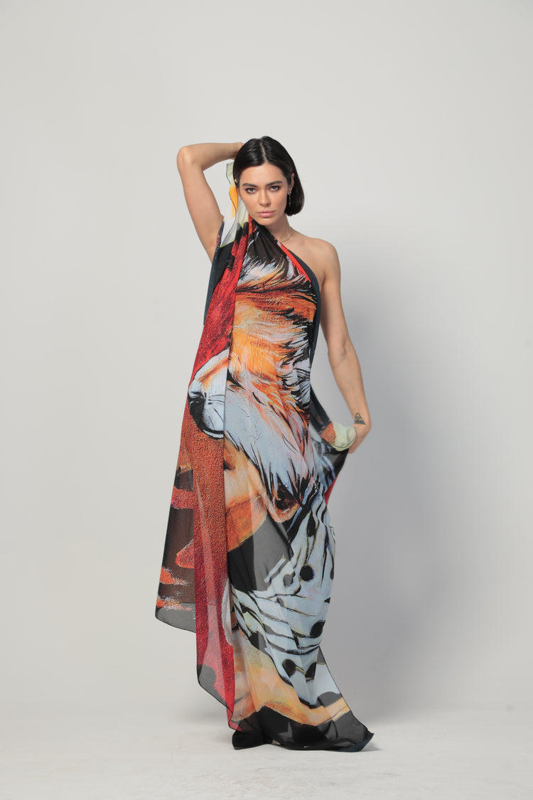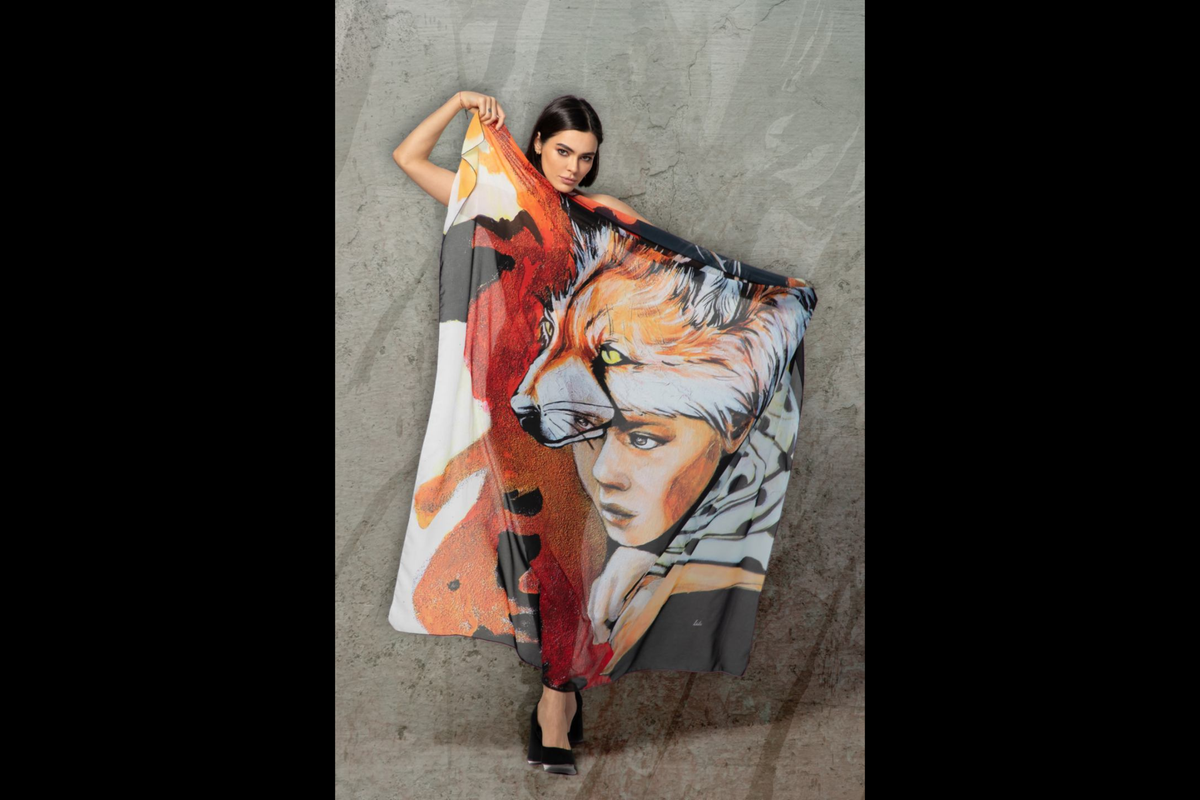 Inspired by Lulu’s evocative painting “Two in One,” this scarf channels a serene and introspective mood through soft, calming hues and a delicate interplay of abstract and natural motifs. The design captures the balance of dualities—light and shadow, strength and softness, movement and stillness.
